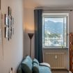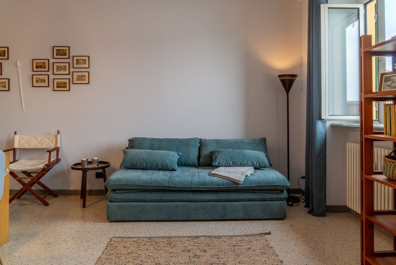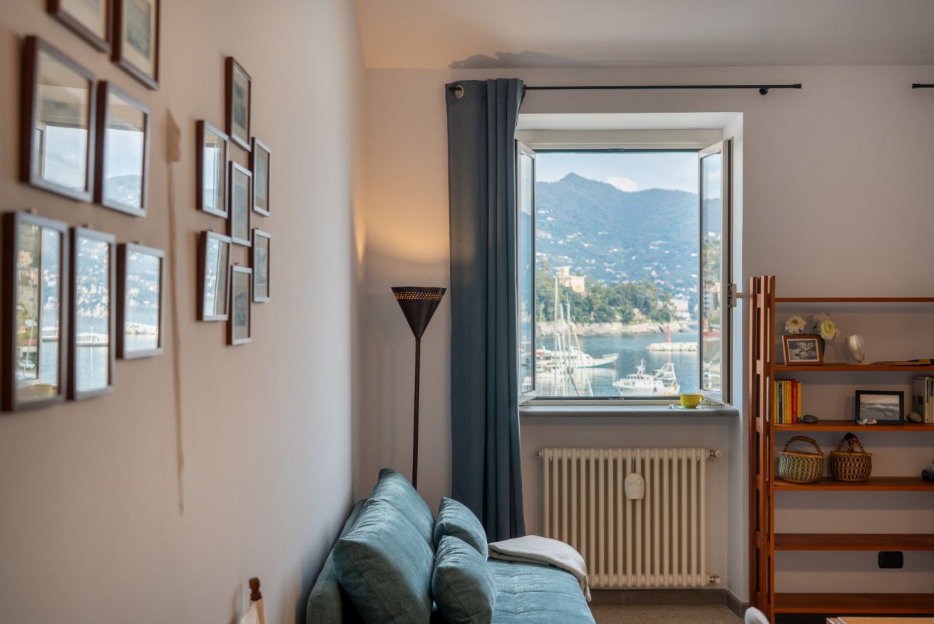 Il soggiorno è il cuore della casa: uno spazio accogliente con divano letto matrimoniale, perfetto per ospitare comodamente altri due ospiti, e ampie finestre da cui si può ammirare il panorama sul porto con le barche e le colline sullo sfondo. 🛋️✨