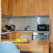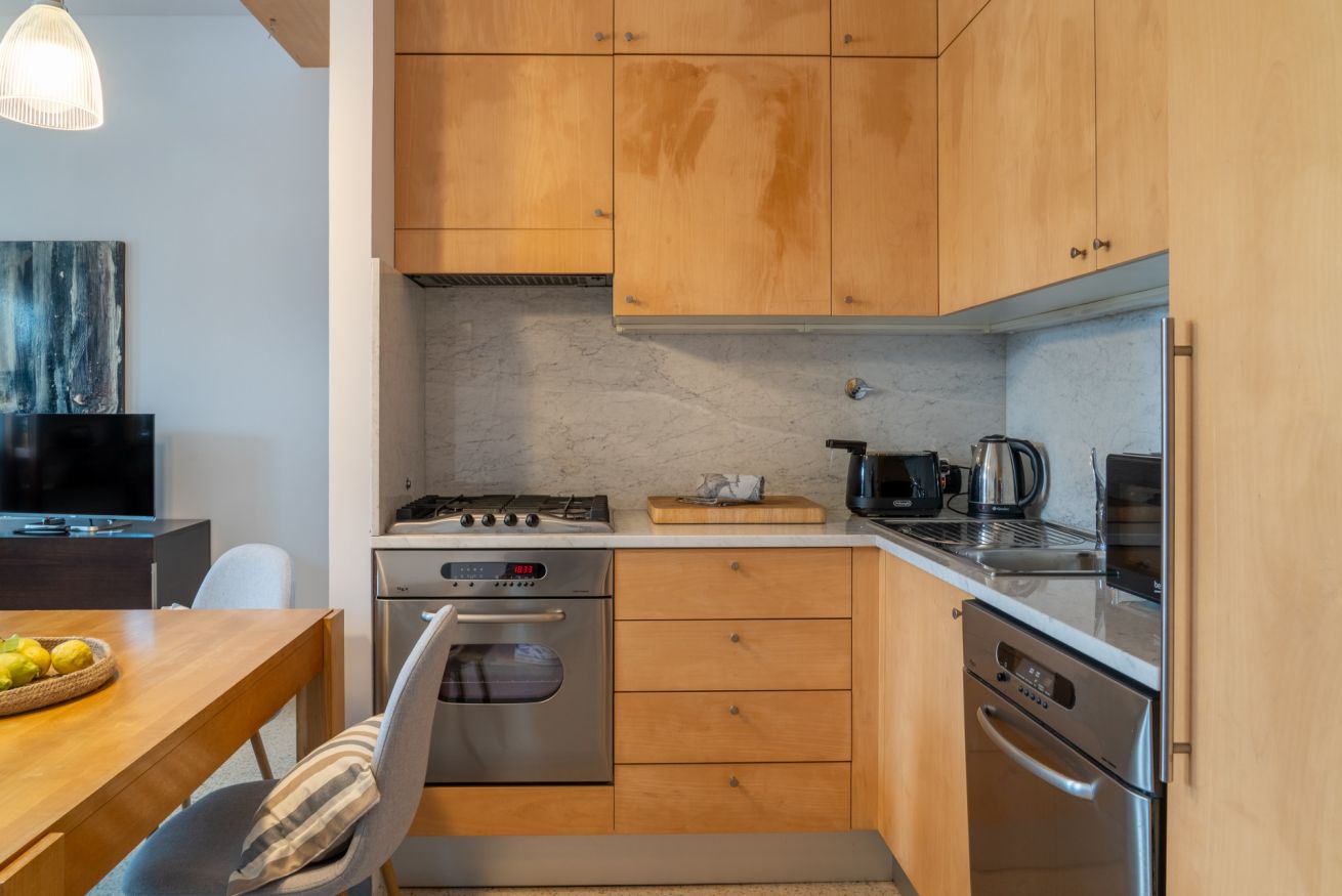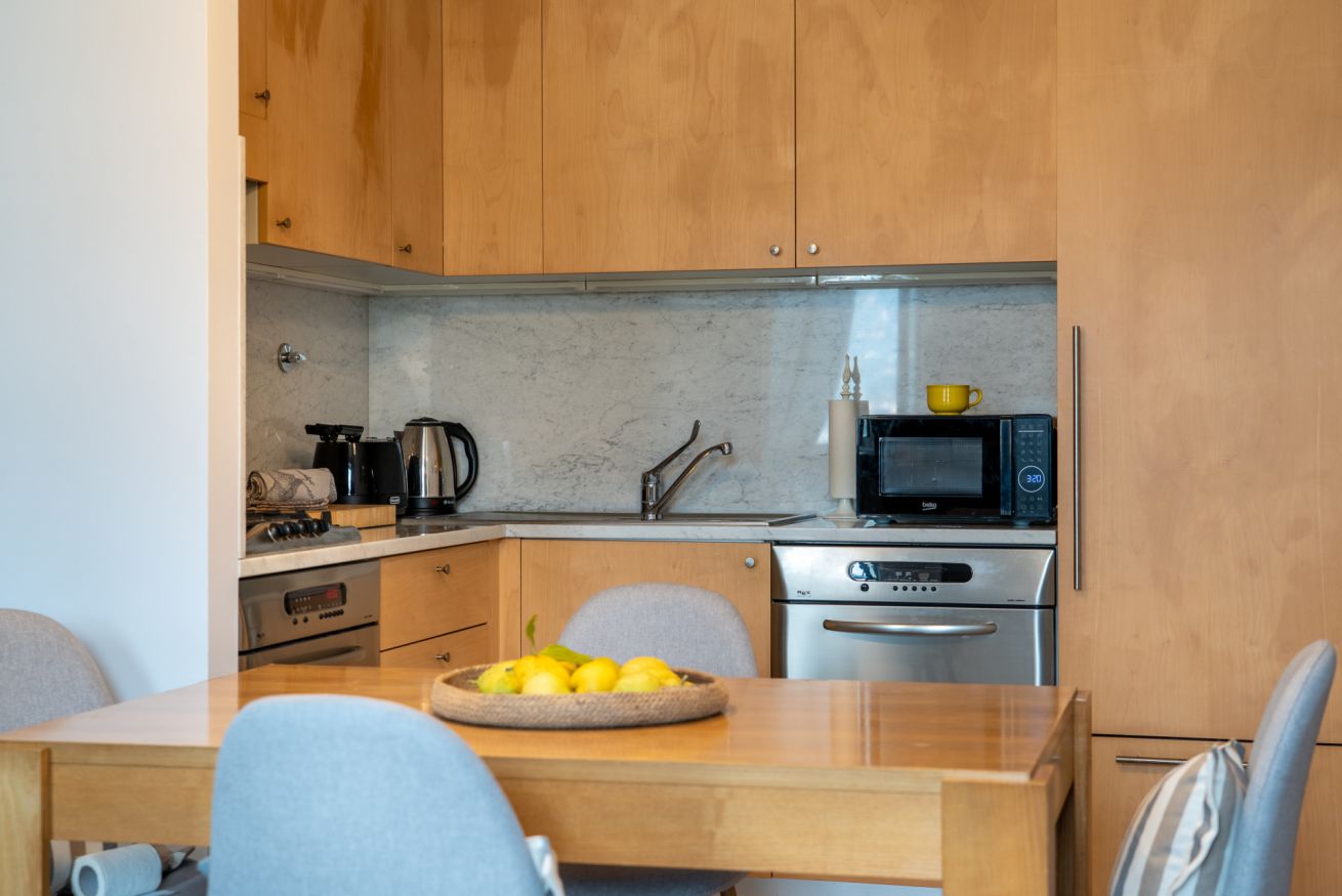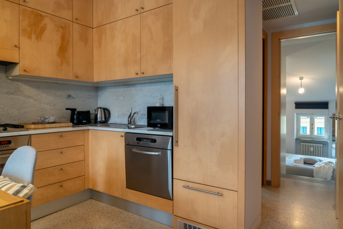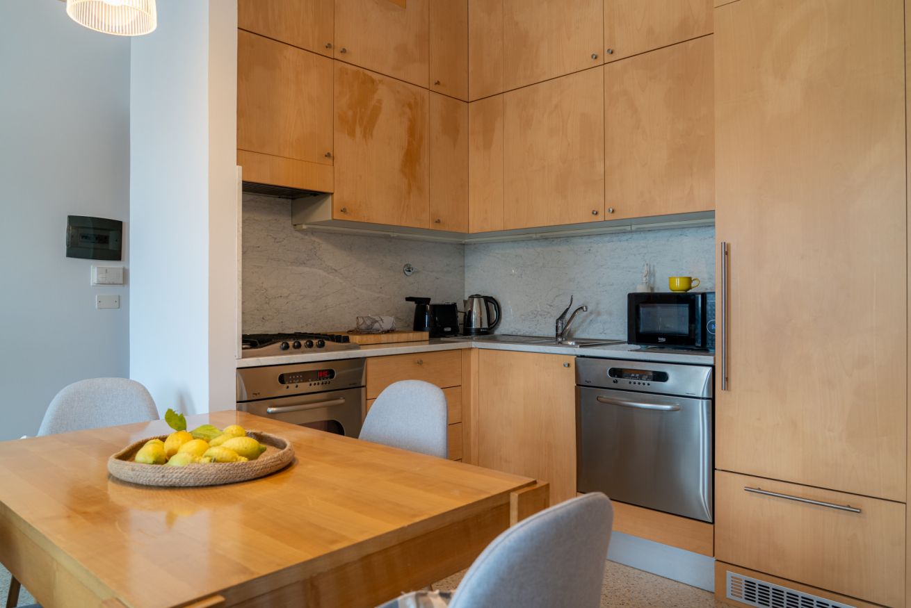 La cucina, moderna e completamente attrezzata, dispone di piano cottura, forno, microonde, lavastoviglie, macchina del caffè e bollitore, ideale per preparare colazioni o pasti in totale comodità. 🍳🍽️